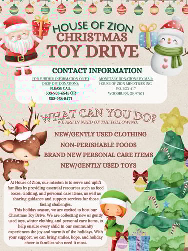 We’re excited to announce that House of Zion Inc., is hosting a Holiday Toy Bag Event to bless families in need this Christmas season!